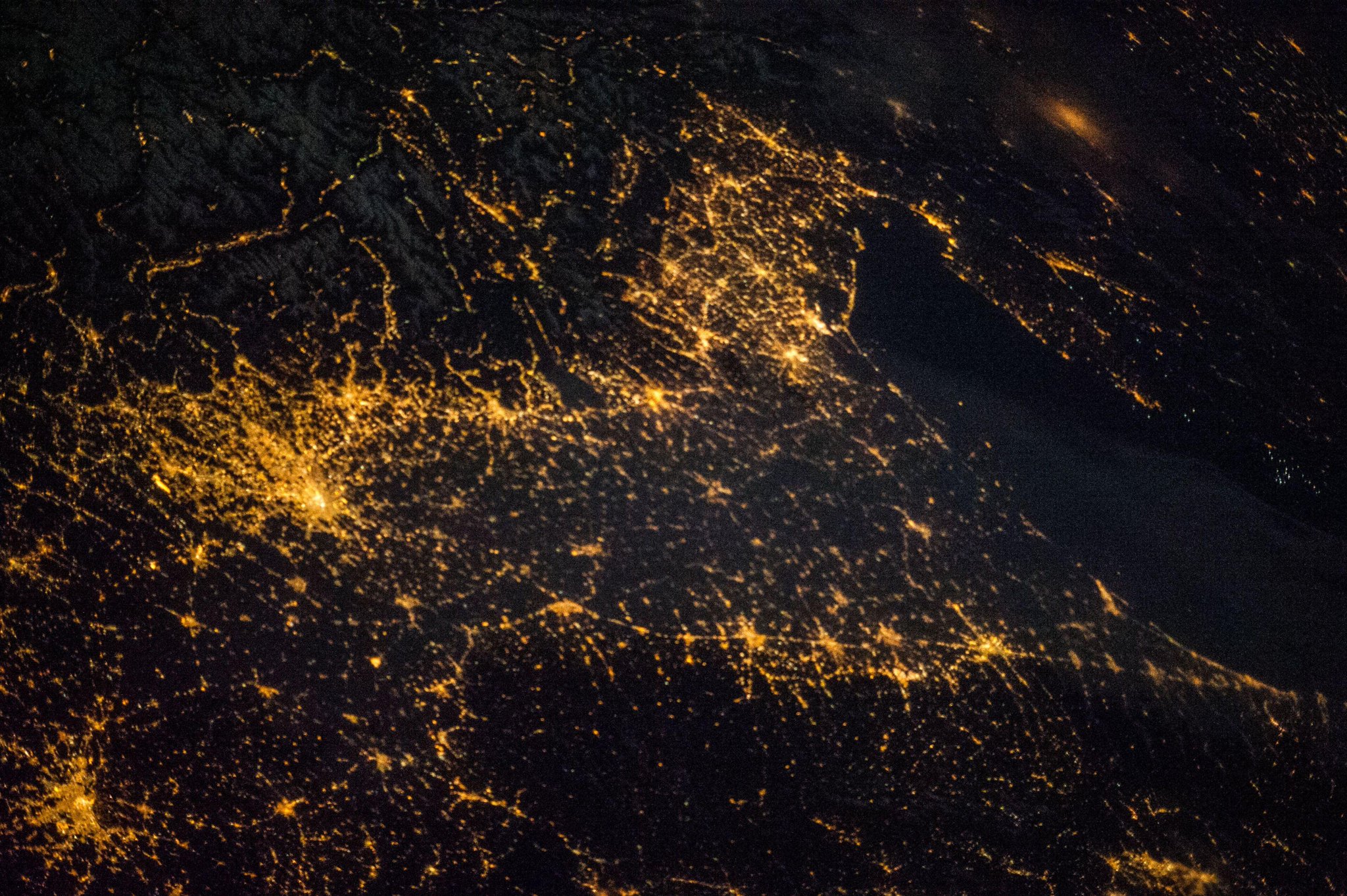 In questa possiamo osservare tutta la Pianura Padana. La città più a sinistra è Torino, mentre ovviamente la più luminosa su tutte è la grande Milano insieme a tutta la sua area metropolitana. Possiamo vedere anche l'antica Via Emilia che corre tra le città di Ariminum (Rimini) e Placentia (Piacenza), nel suo tronco originale. Il punto più evidente lungo questa diagonale è la città di Bologna. Sono visibili anche tutte le vallate alpine, così come le tante città della pianura Veneta con il suo capoluogo in laguna, Venetia.