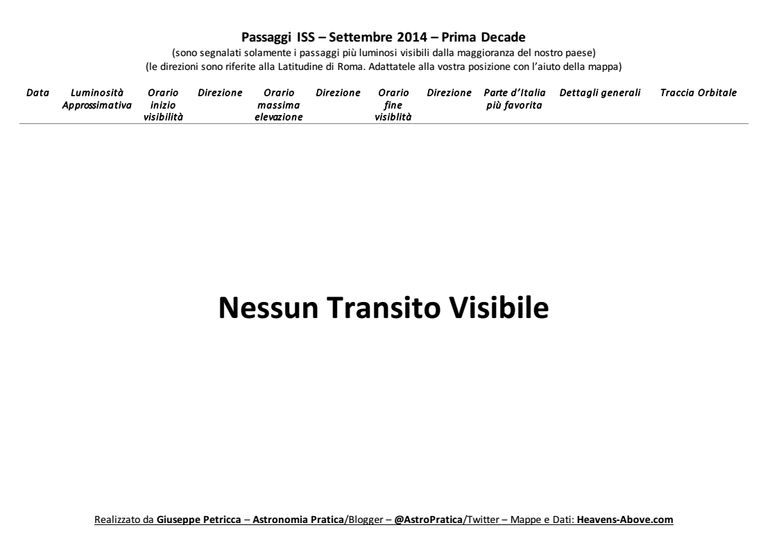 Qui di seguito quindi, trovate il file PDF con tutte le informazioni necessarie! Tutti i passaggi da magnitudine -1.0 in giù per la ISS e i più luminosi per la Tiangong-1 sul nostro paese. Potete scaricarlo e tenerlo sul vostro pc, o stamparlo per averlo sempre a portata di mano. La formattazione è stata pensata anche per i cellulari e tablet, in modo da raggiungere la diffusione e comodità di utilizzo più alta possibile.