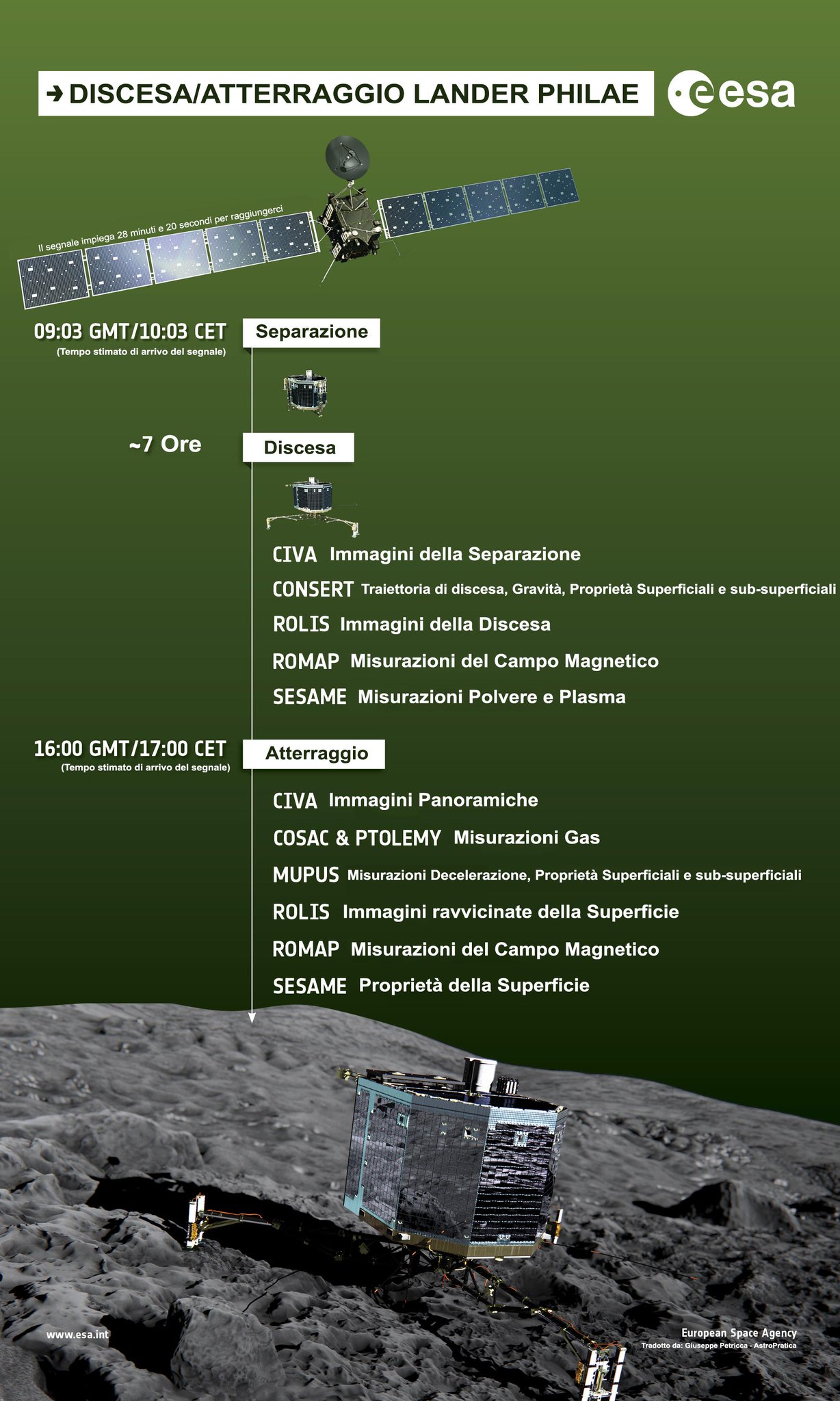 Condivido in conclusione una infografica creata dall'ESA e tradotta dall'autore che mostra a grandi linee la timeline di discesa del lander Philae e su quali misurazioni saranno al lavoro tutti i suoi strumenti, sia durante l'avvicinamento sia dopo l'atterraggio.