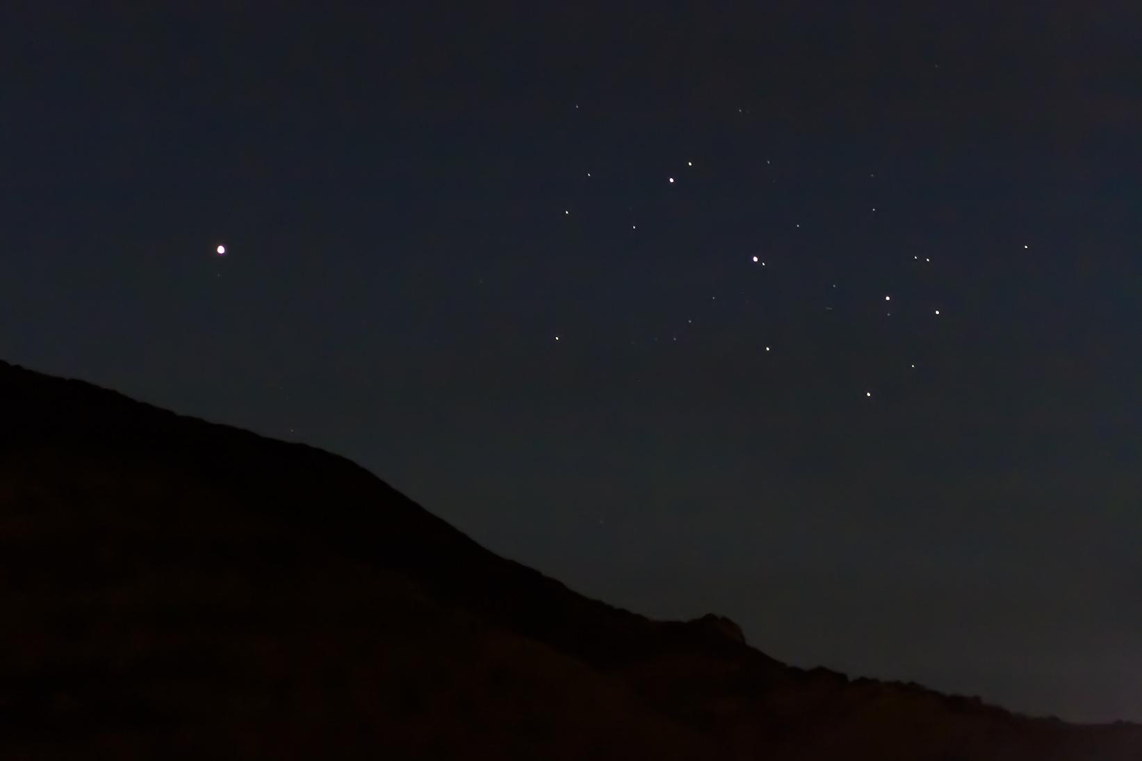 Con un telescopio invece, potremo distinguere la fase del pianeta, ora illuminato di circa il 60%, mentre non potremo ingrandire troppo sull'ammasso stellare dato che è una vista che va apprezzata nella sua totalità.